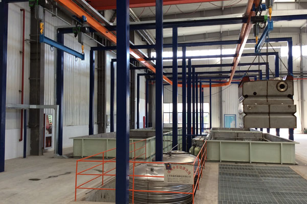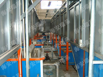 前處理生產線結構特點是:前處理生產線各工序噴淋管布置在隧道內,噴淋由各液槽的泵來提供.各工序間都有門洞板隔開,以防竄液.各加熱液槽的加熱形式有槽內和槽外。內加熱器有排管、蛇形管、波紋板等;外加熱器有列管、板式加熱器等。加熱介質有熱水 、蒸汽、導熱油等。在脫脂、磷化工序分別設有除油系統和除渣系統。為防止各加熱段隧道頂部及門洞處溢出蒸汽,在隧道頂部設有排風機。